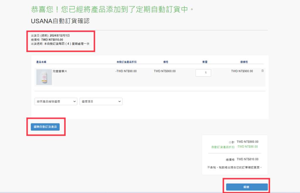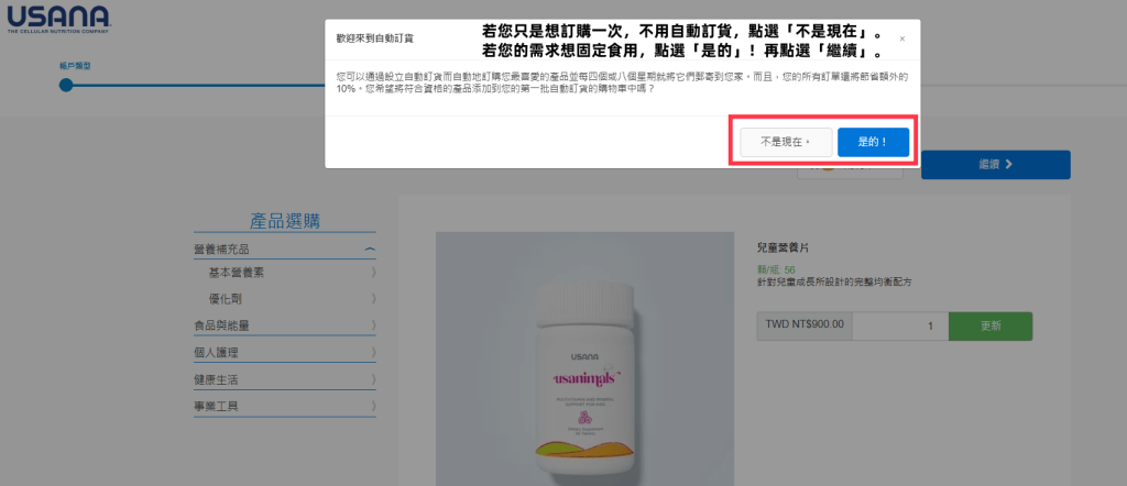 若您的需求想固定食用,點選「是的」!系統有設定每隔28天,進行自動刷卡購買產品,享有9折優惠。也可以未來想要這個功能,再去系統後台設定,再點選「繼續」。
