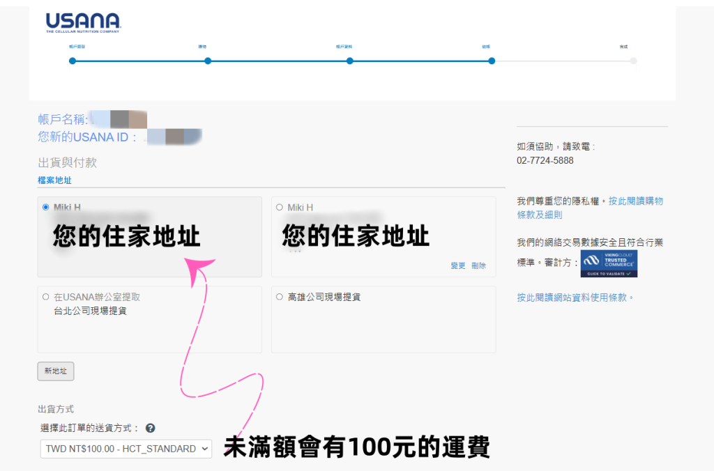 五、最後,系統會出現您的帳戶名稱及會員帳號(可以先行手抄或截圖記下),再設定送貨地址、 信用卡卡號、發票資訊等。另外可以使用家人的信用卡刷卡,刷卡完成訂單成立後,就成為USANA優惠顧客嘍!